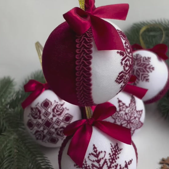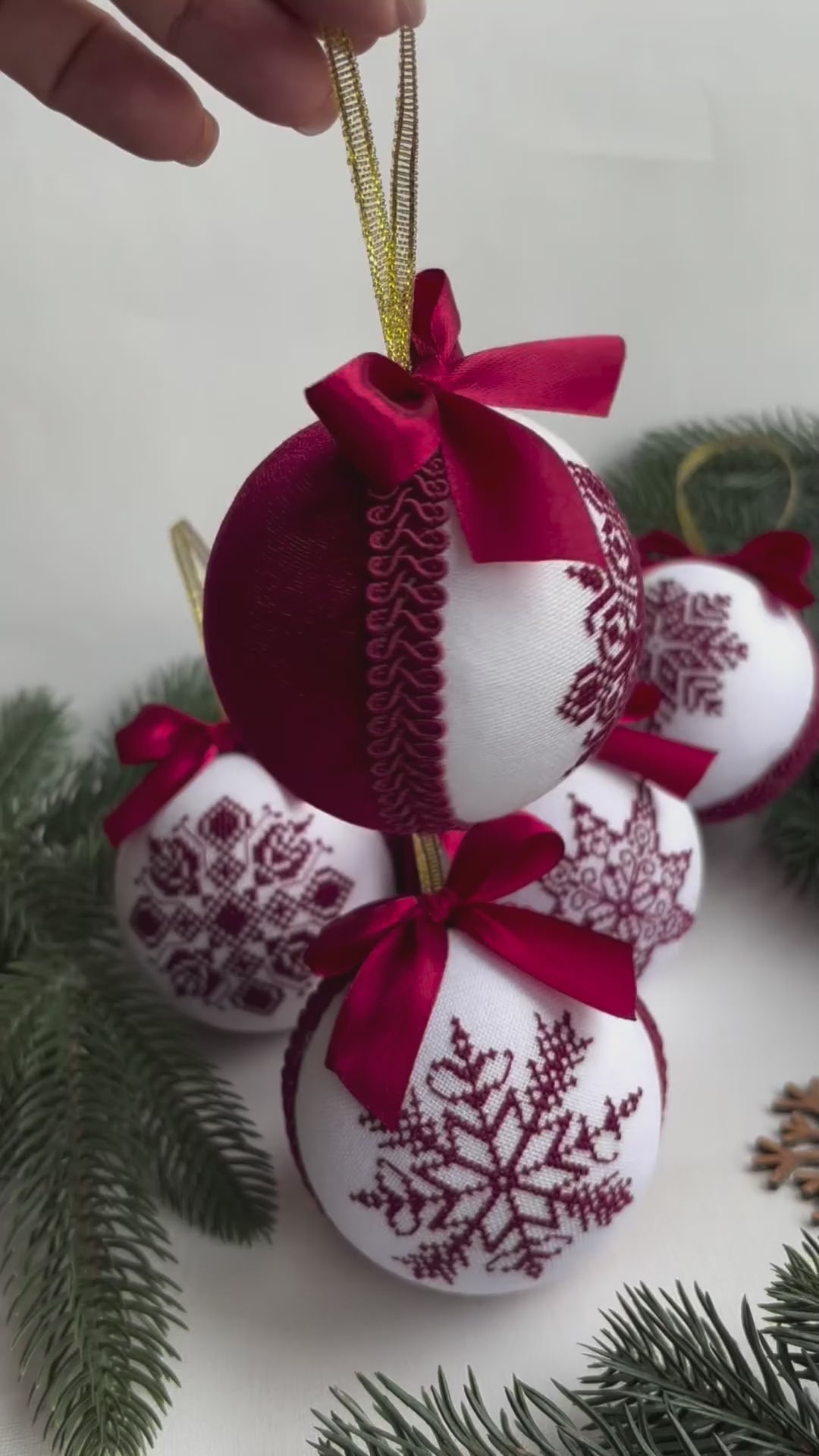 • Handmade Embroidered Christmas Ornaments. Each ornament is carefully crafted and embroidered by hand, featuring intricate red patterns on white fabric that symbolize warmth, joy, and festive spirit. Perfect for decorating your Christmas tree or gifting to loved ones — these ornaments bring elegance and meaning to every celebration.