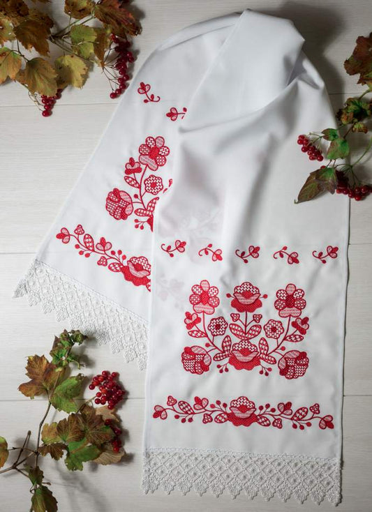 Adorned with rich red floral embroidery symbolizing love, unity, and fertility, each towel is meticulously crafted on white fabric and finished with delicate lace edges. Perfect for weddings, blessings, or as a meaningful keepsake, this rushnyk brings a touch of authentic Ukrainian heritage to your special day.Sale